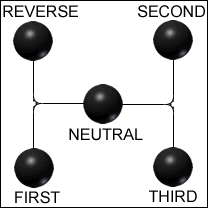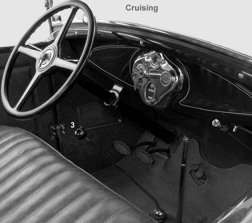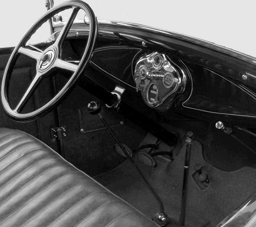 1. The Model A has just been started. 2. Apply the foot brake. 3. Release the parking brake. 4. Disengage the clutch (push down). 5. Move the shift lever to the left and back for first gear. 6. Let up on brake 7. Gradually release clutch and lightly accelerate at the same time. 8. When the car has reached a speed of approximately 10 MPH, push in the clutch, shift into neutral, let the clutch out, put clutch back |