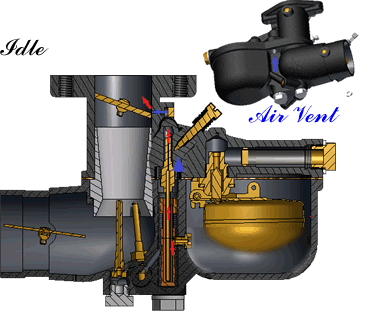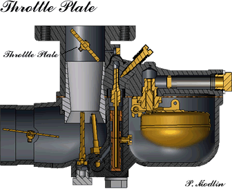Idling occurs when the "Throttle Plate" is partially open. A vacuum above the plate is created, drawing air through a small hole, which pulls the gas from the secondary well through the "Idle Jet". |