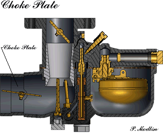 Pulling on the Carburetor Adjustment Knob, often called the GAV (Gas Air Valve) inside the cab opens and closes the Choke Plate. Turning the GAV enriches or leans the fuel mixture flowing through the "Cap Jet". |