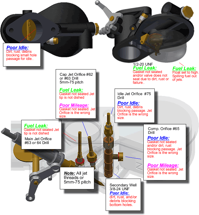 Zenith carburetor documentation: Good grief! Another article on the Model A Ford Zenith carburetor. Enough already! There must be a whole floor in the library of congress devoted to articles written about this carburetor. But wait! If you are into rebuilding Zenith carburetors you might want to read this. This article is about an easy way to check if the internal passageways in the carburetor are open or plugged. | ||