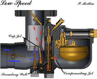 The “Compensating Jet” is inside the fuel bowl and empties into the “Secondary Well” which is open to the air. The “Cap Jet” connects with the “Secondary Well”. The “Cap Jet” can only draw as much fuel as the “Compensating Jet” will allow, regardless of the amount of suction. |