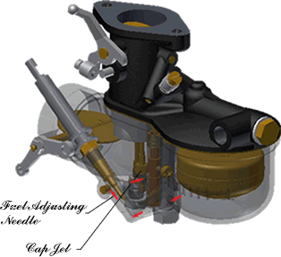 The “Main Jet” is connected directly to the "Fuel Bowl". It acts like a straw; the stronger the suction the greater amount of fuel will be supplied. The "Main Jet" kicks in and helps out the "Cap Jet" at higher speeds. When cruising, the "Cap Jet" can be leaned out (turn right) to conserve on fuel. |