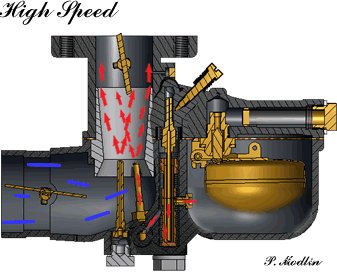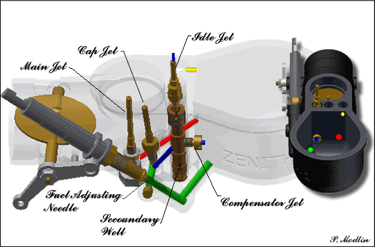 GREEN: Adjustable fuel supply for Cap Jet BLUE: Predetermined fuel supply by Compensator Jet for Cap Jet and Idle Jet RED: Direct fuel supply for Main Jet (Used for High Speeds) YELLOW: Ambient air to fuel bowl